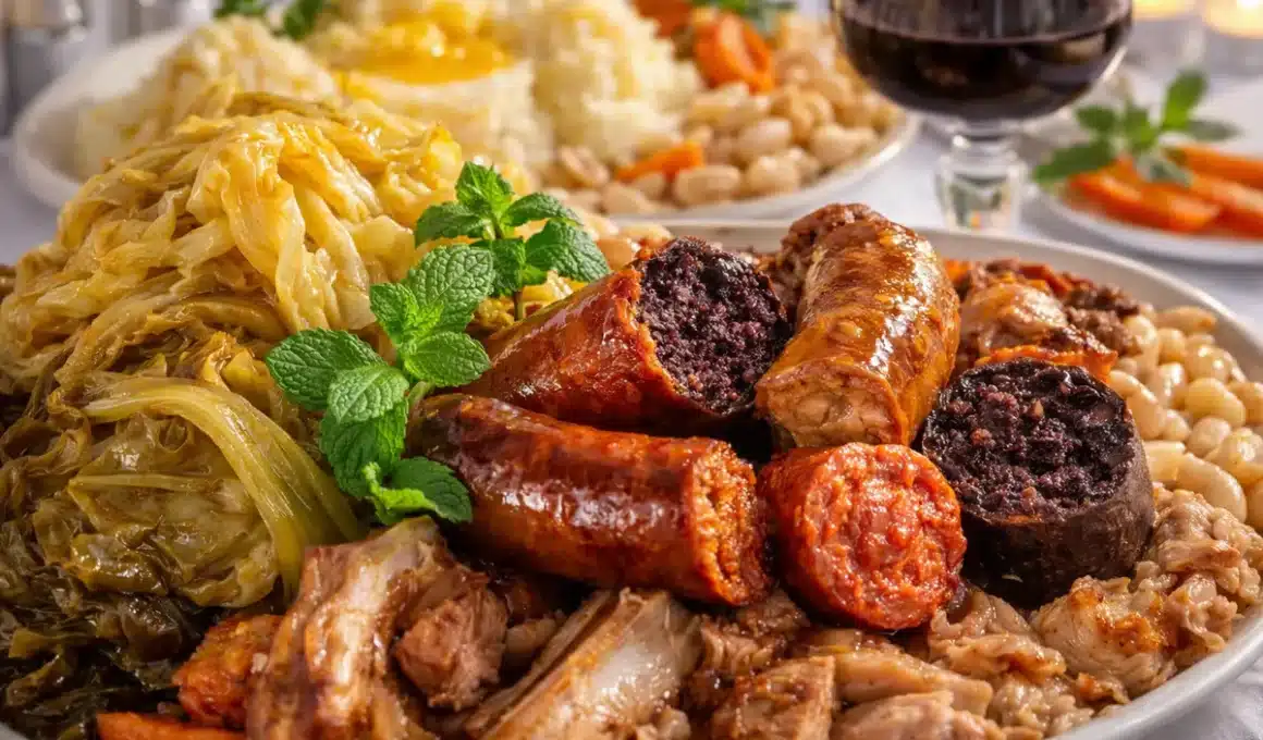 Le trio de base : jarret de bœuf, morceaux de porc (pied, oreille, palette demi-sel) et poulet. Les enchidos indispensables : farinheira, morcela, chouriço. Les abats (langue, tête) renforcent l’authenticité mais restent facultatifs.